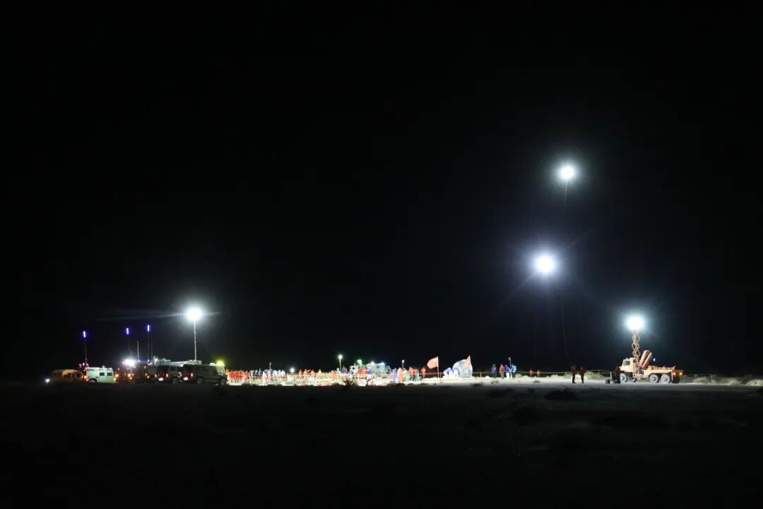 同时,酒泉卫星发射中心为了解决着陆现场照明灯和车载光线照射角度平直问题,升级了无人机夜间照明系统,组建多机协同照明,为现场搜救队员和背光人员提供大范围照明,并通过优化照明角度与覆盖范围,避免灯光反射造成的视觉干扰。